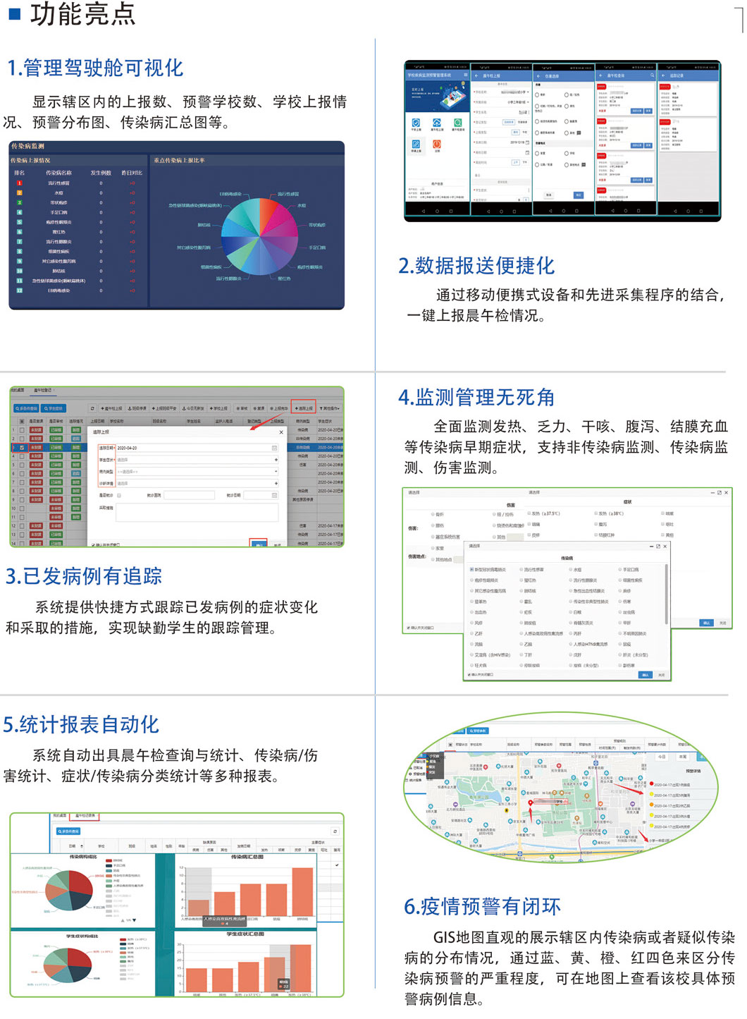 系統服務于學校傳染病早期預警監測,為學校傳染病疫情和突發公共衛生事件得以早發現、早報告、早控制提供準確、可靠的早期癥狀數據和預警,使之成為學校傳染病監測體系的第一道監測關口。系統支持幼、小、初、高、大學所有學段每日展午檢及因病缺勤情況登記、缺勤追蹤、自動預警和統計分析等功能,有效提升學校防控傳染病的能力。