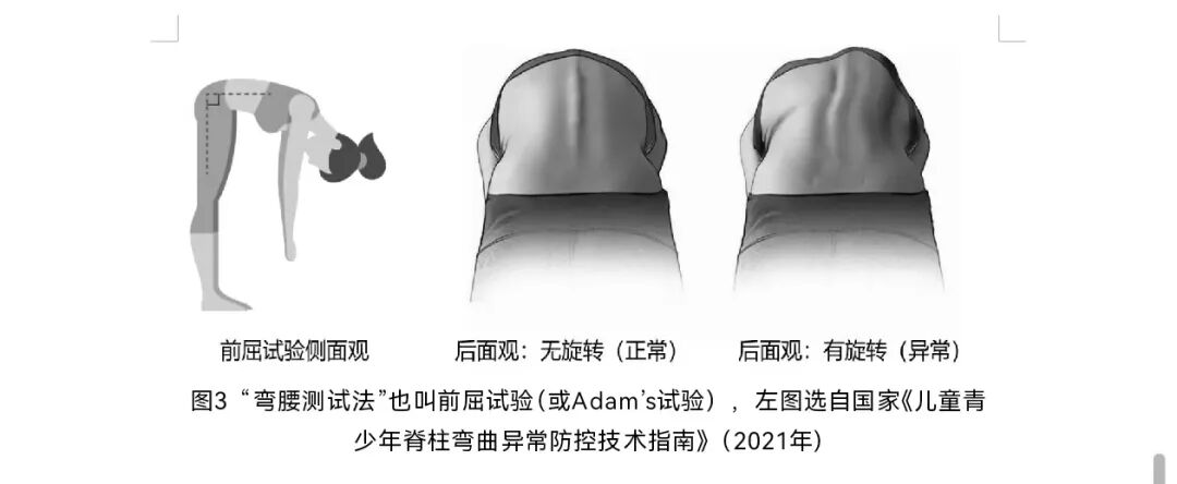 圖3 “彎腰測試法”也叫前屈試驗(或Adam’s試驗),左圖選自國家《兒童青少年脊柱彎曲異常防控技術指南》(2021年)